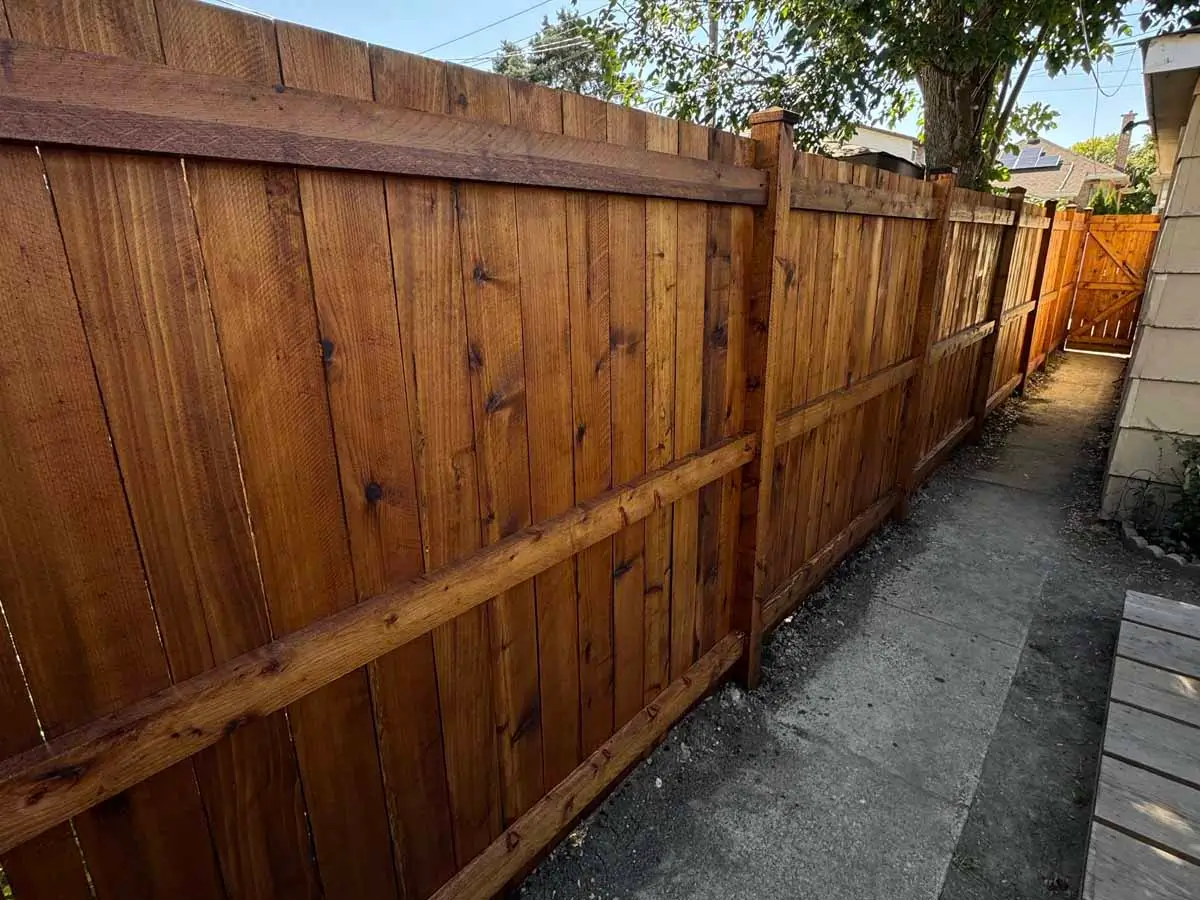 Each cedar board is stained before installation using our professional dipping system. This protects all sides of the wood, including areas that cannot be reached after the fence is installed.
